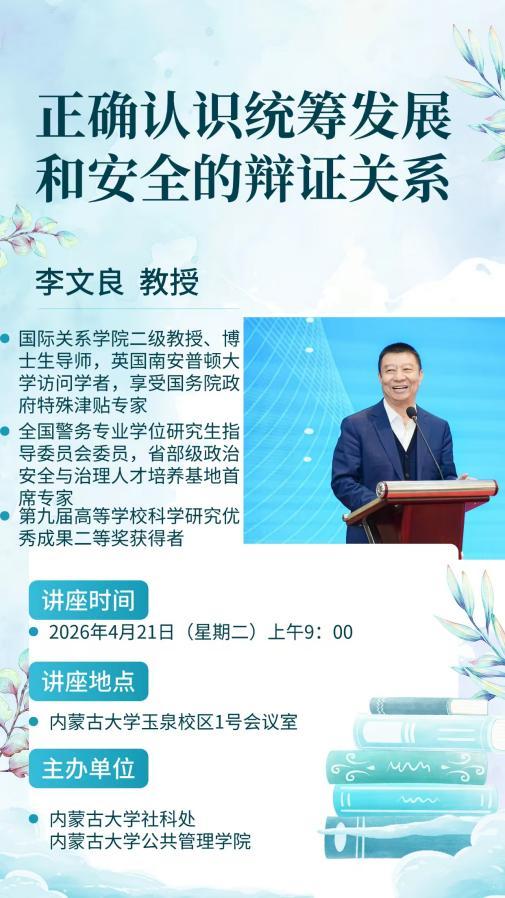 2026年4月10日,首届“国家安全与平安建设”案例征集活动颁奖仪式在上海交通大学隆重举行。我院李沃源、鲍伟慧老师指导,学硕研究生赵伊杨、李佳鑫,MPA研究生赵含霖、王茜共同撰写的案例《筑牢北方生态安全屏障,解译沙海逆袭与绿富同兴的“磴口密码”》荣获“总体国家安全关键领域”赛道优秀奖,展现了我院在国家安全研究与学科建设中的扎实成果。本次案例征集活动由上海市学校国家安全教育指导委员会指导、上海交通大学主办...