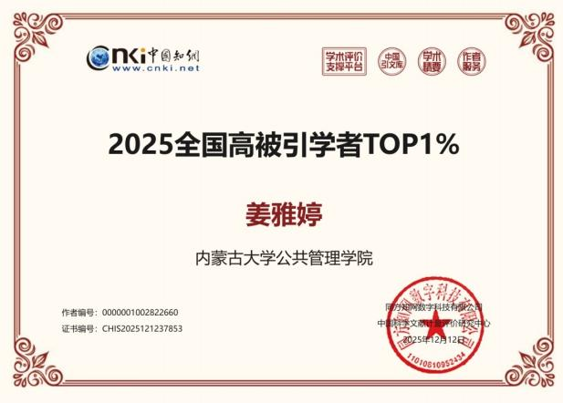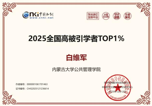 日前,中国知网下属的中国科学文献计量评价研究中心发布了“2025全国高被引学者”名单。太阳成集团tyc522cc7名教师入选该名单,其中白维军、姜雅婷老师入选“2025全国高被引学者TOP1%”名单;苏敏、王芳、刘成、王宏亮、武俊伟老师5人入选“2025全国高被引学者TOP5%”名单。