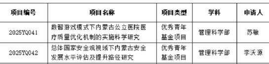 2.2位教师获2025年内蒙古自治区自然科学优秀青年基金项目,1位教师获2025年内蒙古自治区“高等学校青年科技人才发展项目”,1位教师被评选为2025年度内蒙古自治区青年创新人才,1位教师当选内蒙古自治区经管类教指委委员。