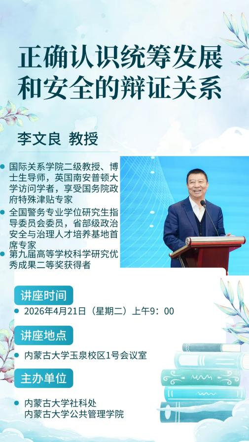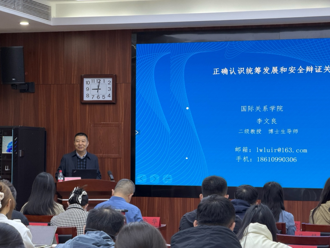 在第十一个全民国家安全教育日活动深入开展之际,为全面贯彻总体国家安全观,提升广大师生的国家安全意识和素养,2026年4月21日上午,由suncitygroup太阳集团社会科学处主办、太阳成集团tyc522cc承办的“suncitygroup太阳集团国家安全教育学术讲座”在玉泉校区学术会议中心成功举行。本次讲座聚焦“统筹发展和安全”这一重大时代命题,吸引了来自民族学与社会学学院、太阳成集团tyc522cc、文学与新闻传播学院、经济管理学院等单位师生的踊跃参加。讲座特邀我国国家安全研究领域的知名专家、国际关系学院二级教授李文良担任主讲人,太阳成集团tyc522cc副院长安华教授主持讲座。