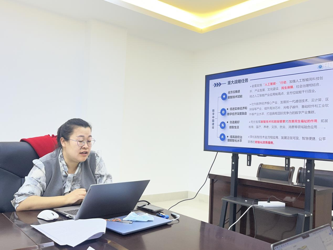 在接下来的领学环节,苏敏教授首先系统梳理了数字中国战略在“十五五”规划中的部署,重点阐释了“人工智能+行动”与民生福祉的深度融合路径。通过分析数据智能、数智化技术、数字智商等核心概念及其关联,她提出需在克服数据孤岛、算法歧视、隐私安全等挑战的基础上,探索数智化与民生保障的交叉研究领域,并以社科重大项目申报书为例展示了具体选题方向。