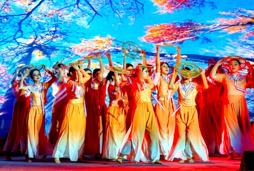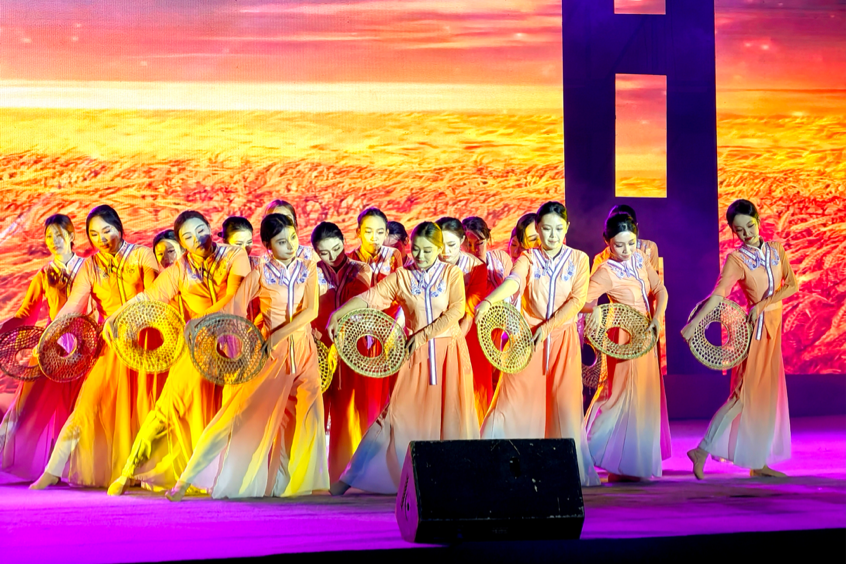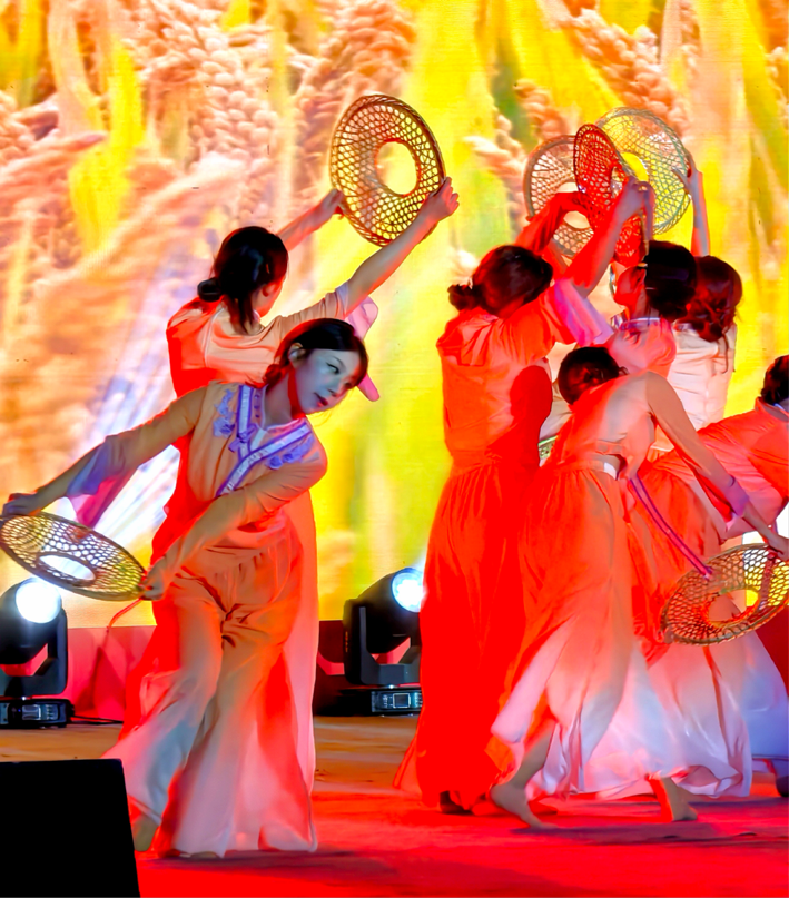 舞台上,草帽随舞步轻扬,舞者们以身为笔、以情为墨,化身为田野中的麦浪,在舞台这方“大地画卷”上勾勒出农耕图景的生动肌理。她们的身姿时而如破土新芽,迸发着生命初绽的渴望;时而似迎风麦穗,摇曳着作物生长的律动。人与自然的和谐共生之道,在这一俯一仰的舞姿中流转,在这一呼一吸的韵律中铺展。